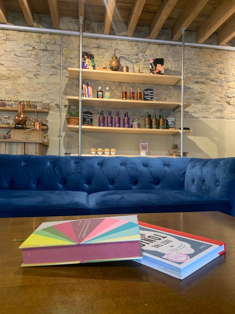 A warm welcome into the distillery a three hundred years-old converted barn. We turned left straight to the bar, a beautiful open room, a bar with walls decorated with copper accented bottles, complimented by lush navy velvet sofas, all very classic. Lots of jars of Botanicals line up against the wall for the gin making experience ( more on that another time).